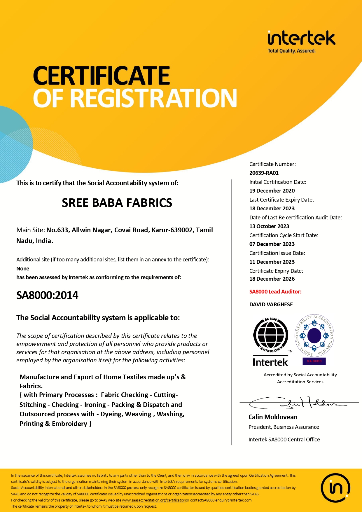 An ISO 9001:2015, SA 8000:2014, Oeko Tex, BSCI audited, Sedex audited, GOTS, Fair wage certified company
